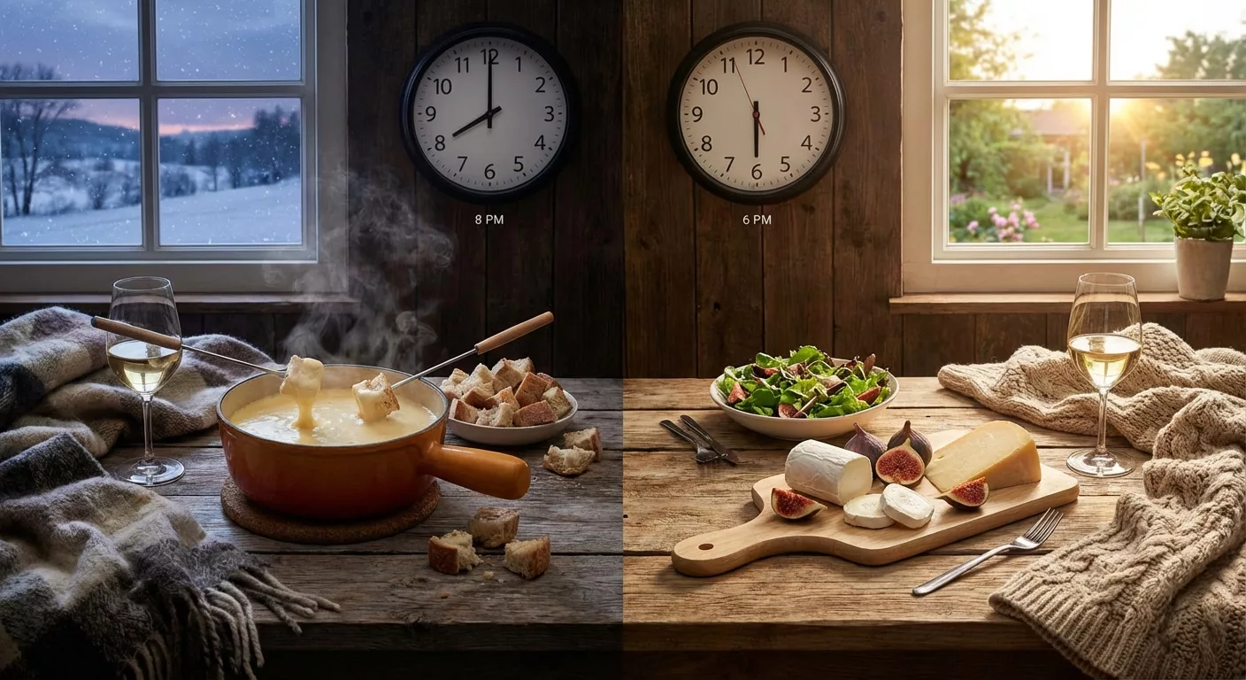 Le fromage ne se vit pas pareil à 19 h ou à 22 h. Un dîner tôt laisse plus de marge pour digérer un plat riche, surtout si la journée a été active. Un dîner tard demande plus de légèreté, même en hiver, pour éviter la sensation de lourdeur.