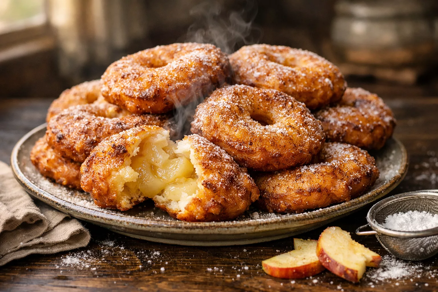 Il suffit de plonger une rondelle de pomme dans une pâte légère et de l’entendre crépiter dans l’huile chaude pour que les souvenirs affluent. Les beignets aux pommes à l’ancienne, ce sont ces douceurs dorées que l’on dégustait encore tièdes, saupoudrées de sucre, les doigts légèrement collants et le sourire aux lèvres. À l’intérieur, la pomme devient fondante, presque compotée, tandis que l’extérieur forme une coque croustillante et légèrement gonflée. Cette recette traditionnelle, simple et généreuse, ne demande que quelques ingrédients du placard et un peu d’attention. Elle transforme un après-midi ordinaire en moment chaleureux, parfumé à la vanille et à la cannelle. Parfaits pour le goûter, le carnaval ou un dessert improvisé, ces beignets sont une invitation à ralentir et à savourer l’instant.