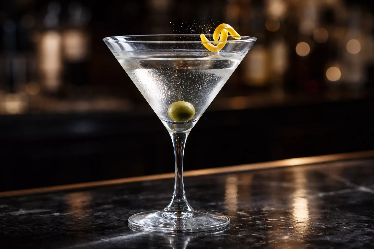 Dépose une olive verte au fond du verre ou exprime un zeste de citron au-dessus du cocktail avant de le glisser dans le verre. Sers immédiatement.