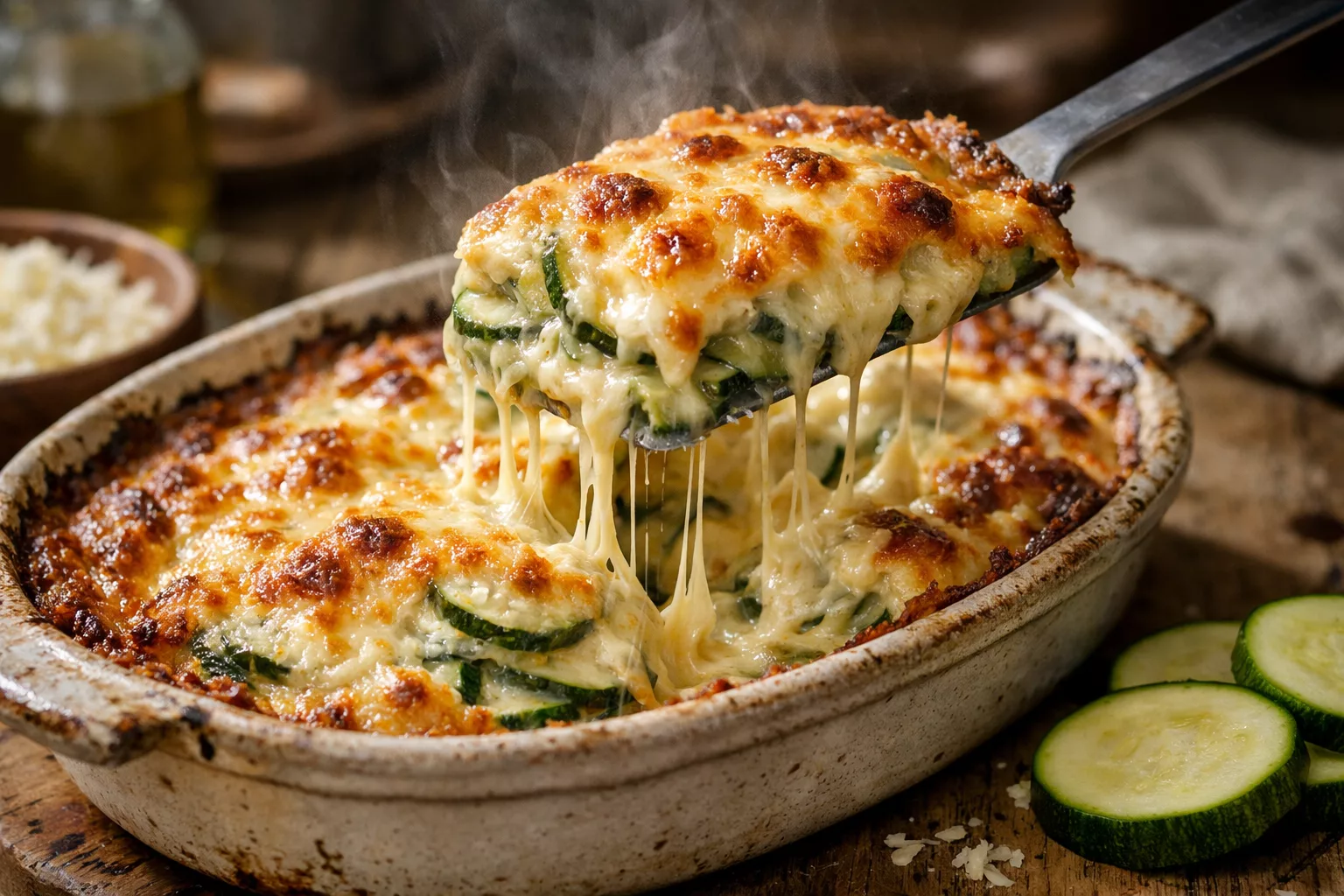 Il y a des plats simples qui ont le pouvoir de transformer un dîner ordinaire en moment chaleureux. Le gratin de courgettes fait partie de ces recettes familiales que l’on prépare presque les yeux fermés, mais qui font toujours plaisir à table. Entre la douceur légèrement sucrée des courgettes fondantes, la crème onctueuse et la fine croûte dorée de fromage gratiné, chaque bouchée est à la fois réconfortante et gourmande. Ce gratin rapide est idéal pour les soirs de semaine où l’on veut cuisiner quelque chose de maison sans passer des heures en cuisine. Les courgettes cuisent doucement au four et deviennent tendres, presque confites, pendant que le fromage forme une surface croustillante irrésistible. Servi seul avec une salade croquante ou en accompagnement d’une viande ou d’un poisson, ce gratin simple et savoureux rappelle les repas conviviaux de la cuisine familiale. Une recette facile, accessible aux débutants, mais qui donne toujours l’impression d’avoir cuisiné un vrai bon plat maison.