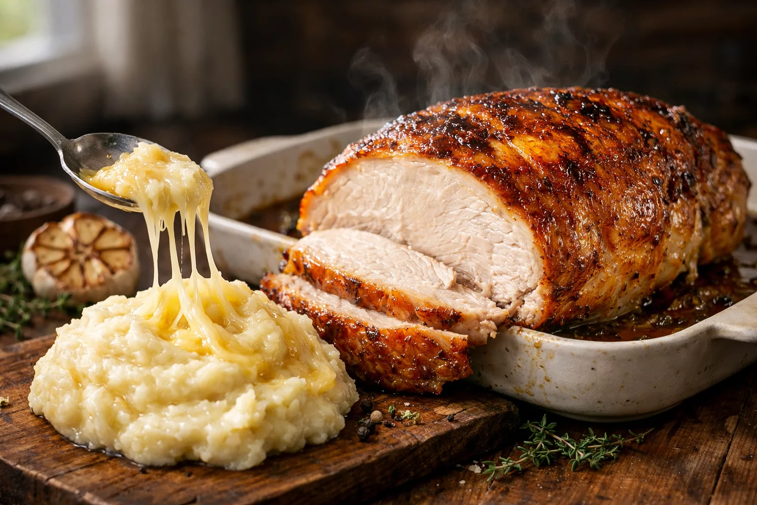 Servez ce rôti de dinde avec une purée maison enrichie d’un peu de comté ou de tomme râpée. Leur fondant et leurs notes légèrement fruitées s’accordent parfaitement avec la douceur de la dinde.